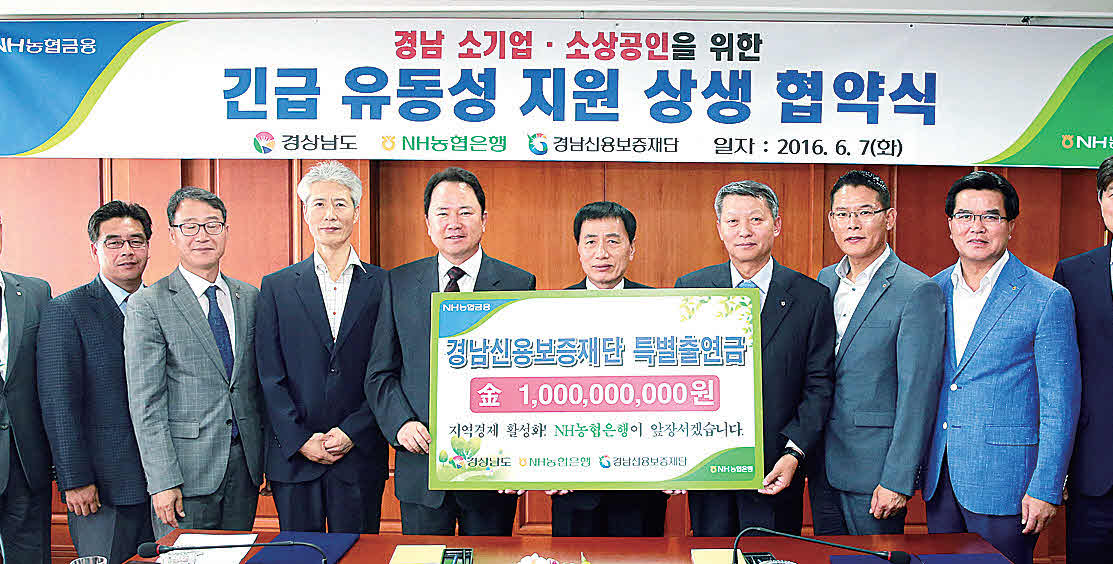 NH농협은행 경남영업본부(본부장 이구환)는 지난 7일 3층 대의원회의실에서 경상남도, 경남신용보증재단과 ‘경남 소기업·소상공인 긴급 유동성 지원 상생 협약식‘을 체결하고 특별출연금 10억원(대출금액 기준 150억원)을 경남신용보증재단에 출연했다.