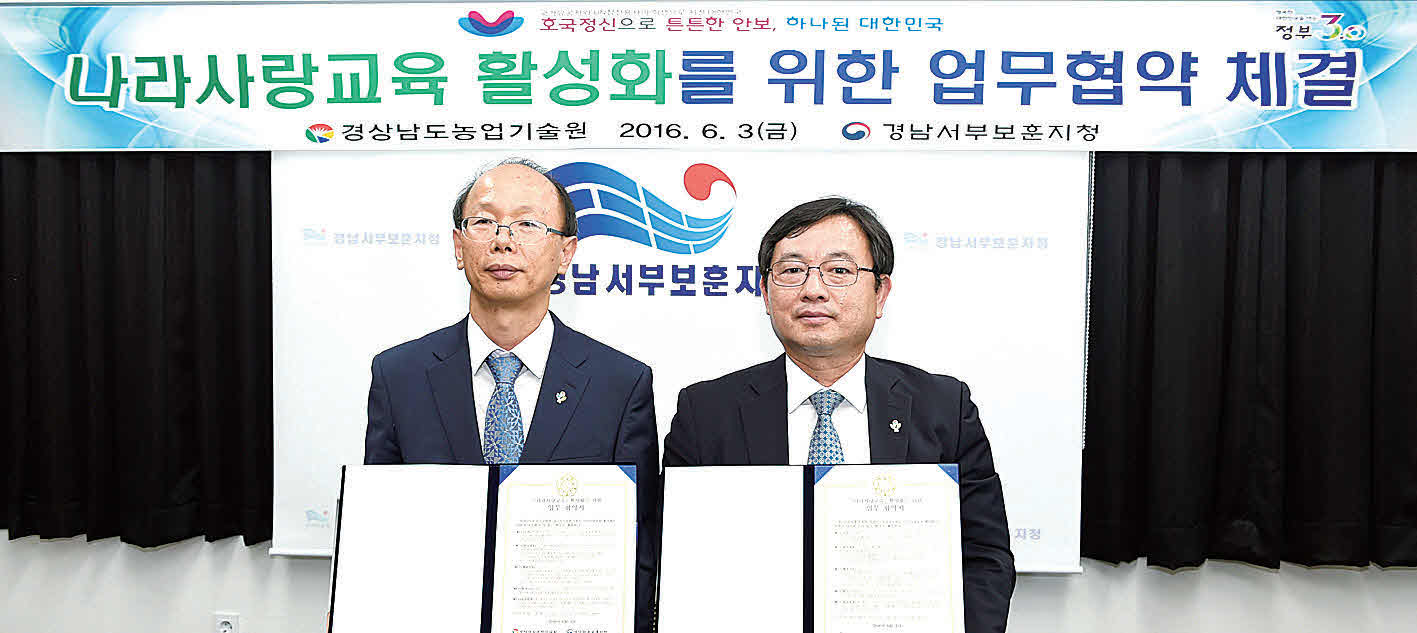 경남농업기술원-경남서부보훈지청, 나라사랑업무협약 체결최 기사입력 2016.06.20 14:09 댓글 0 경남농업기술원(원장 강양수)과 경남서부보훈지청(지청장 김문재)은 지난 3일 나라사랑교육 활성화를 위한 MOU를 체결했다. 이번 협약은 국민의 올바른 국가관 및 나라사랑정신 함양을 위한 상호교류 및 협력체계를 구축하기 위해 체결되었으며 양 기관은 농업 교육과정을 활용한 나라사랑교육 실시 및 나라사랑교육 운영에 필요한 자료제공 및 정보교류 등에 상호 협력하기로 합의했다. <저작권자ⓒ농림축산신문 & nongnews.kr 무단전재-재배포금지. > BEST 뉴스 경북화훼 수출산업 활성화, ·경북농협, ‘이탈리안 라이그라스(IRG) 파종시연회’ 개최 ·대구시, 신천서 벼 베기 체험 및 수확 기쁨 체험 ·대구농협-대구NH농협은행, 농촌 일손돕기 개최 ·충북농기원, 자체개발 ‘아로니아 특허기술’ 상품화 선점 ·전문가 칼럼 위로 목록 이름 비밀번호 자동등록방지 46945 등록