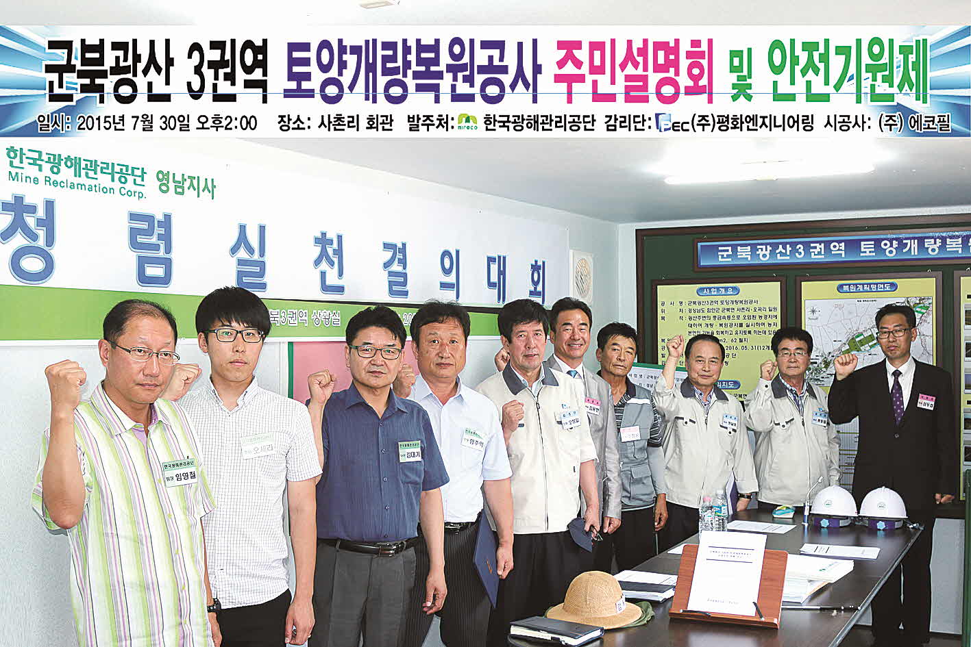 한국광해관리공단 영남지사(지사장 김대기)는 지난달 30일 ‘군북광산 3권역 토양개량복원공사 주민설명회 및 안전기원제’를 군관계자와 마을이장을 비롯해 한국광해관리공단 임?직원과 시공사인 (주)에코필 및 감리회사인 평화엔지니어링 직원과 주민 등 100여 명이 참석한 가운데 있었다. 경남 함안군 군북면 사촌리 현장 마을회관에서 가진 이날 설명회 및 안전기원제는 그 동안 군북면의 숙원사업으로 추진해 오던 토양개량복원사업을 주민들에게 상세하게 설명하고, 주민들의 이해와 소통의 계기를 마련함으로서?원활하게 사업을 추진키 위한 것이다. 이에 참석주민들의 충분한 이해도를 높이는 주민설명회는 참석한 주민들에게 전체 사업계획의 구도를?설명하고 질의시간을 통해 해당농가들의 의문점을 자세하게?설명하는 시간을 가진 후 본격적인 공사에 들어갔다.