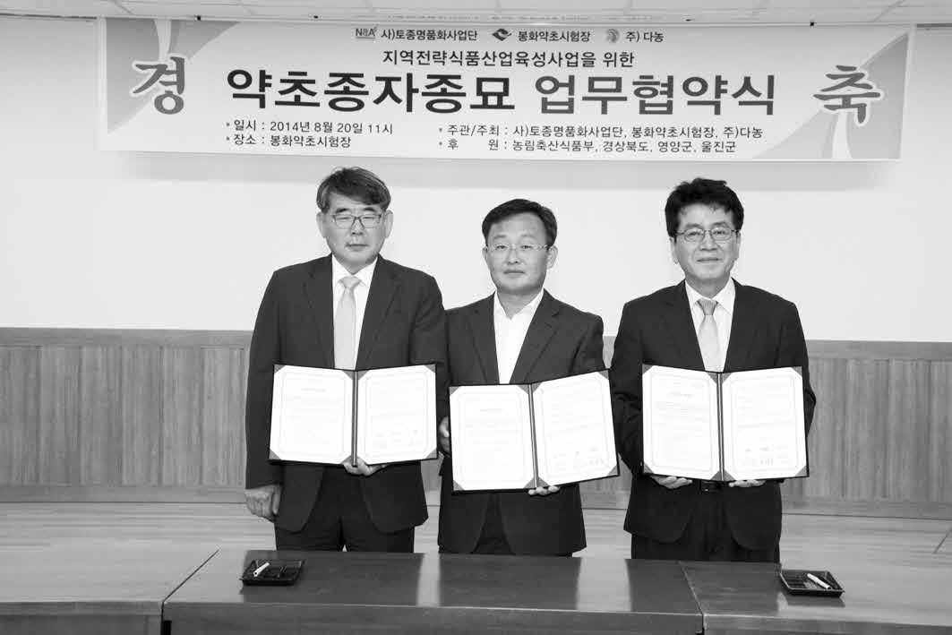 경상북도농업기술원 봉화약초시험장과 사단법인 토종명품화사업단, 주식회사 다농은 약초, 산채 종자의 품종등록, 종자채종, 증식 및 선별, Global 약초종자 개발, 토착화 및 유통관련 공동연구, 종자종묘 육묘사업의 기반 육성 및 지역 약초재배 활성화를 위해 상호 협력하기로 했다.