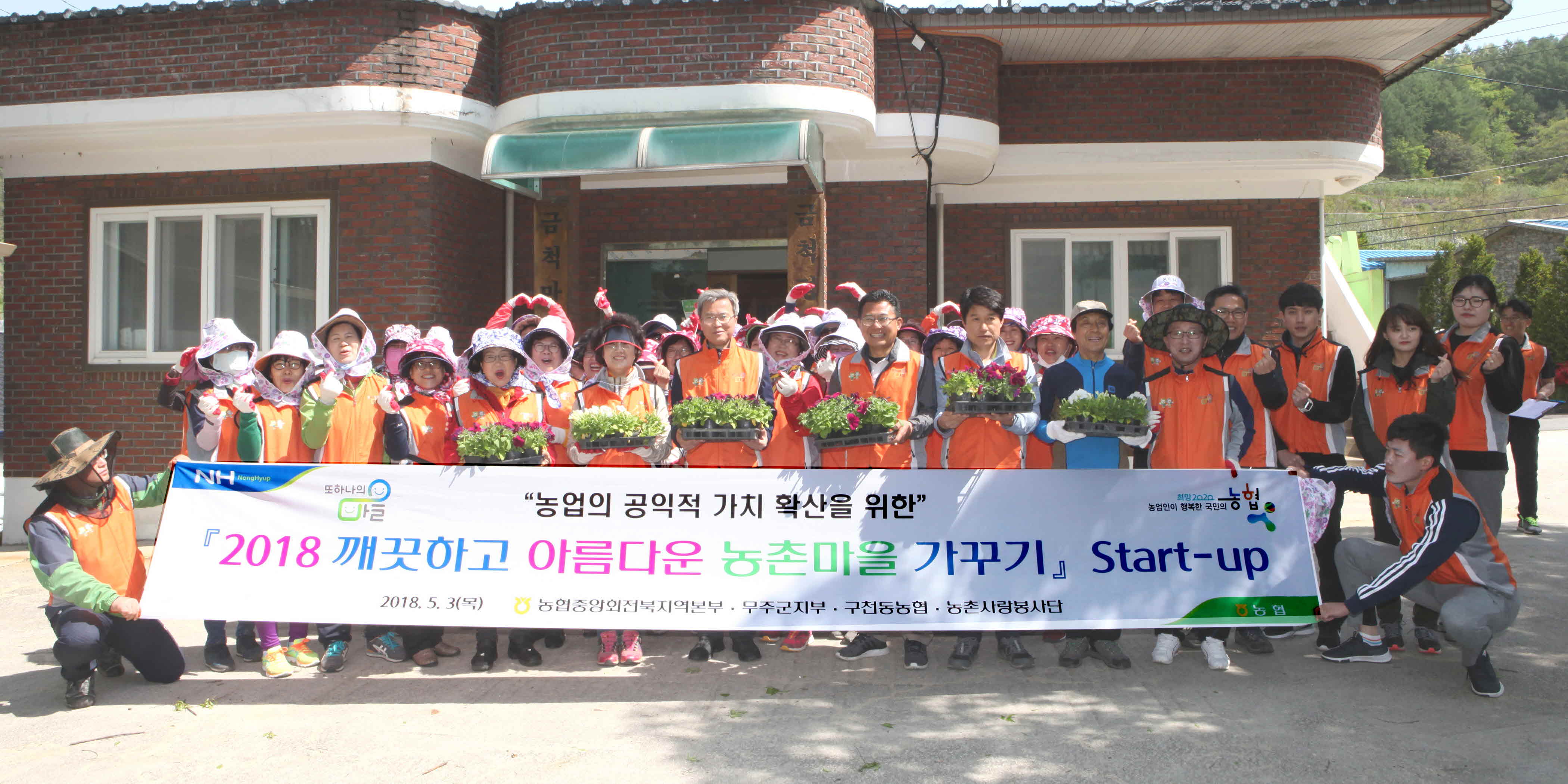 전북농협(본부장 유재도)은 아름다운 농촌경관 유지·발전을 위해 3일 전북 무주군 금척마을에서 ‘깨끗하고 아름다운 농촌마을 가꾸기 Start-up’ 캠페인과 농촌일손돕기를 실시했다. 농협은 지난해 말부터 농업·농촌의 공익적 가치가 헌법에 반영되어야 한다는 염원을 담아 1천 100만명의 서명을 이끌어내 국민적 공감대를 얻는데 성공했다. 여기에 그치지 않고 농협은 깨끗하고 아름다운 농촌경관 유지로 농업·농촌의 공익적 가치를 널리 알리고 농촌에서의 역할을 제시하는 의미로 이번 캠페인을 개최하였다. 이번 캠페인은 농업·농촌의 지속 가능성과 공익적 가치를 널리 알리고 국민의 공감대 확산을 위해 농촌마을 주도로 농촌을 깨끗하고 아름답게 가꾸고 보존·유지하기 위함이며 이를 통해 도시민의 관심과 방문을 촉진시켜 농촌의 다원적 가치를 높이기 위함이다. 이날, 무주군 무풍면 금척마을에서 유재도 전북농협 본부장, 송혁 무주군지부장, 양승욱 구천동농협조합장, 은경휘 농촌사랑봉사단 회장과 80여명의 농협 임직원, 농촌사랑봉사단 회원, 농업인 등이 참여한 가운데 ▴마을 꽃길조성(폐추니아 300포기, 1km), 농촌일손돕기(윤주형 농가, 사과 꽃따기, 2,000평) 등을 실시했다.