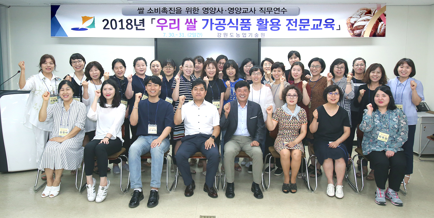 강원농업기술원(원장 김태석)은 지난 30일부터 2일간 본원 생활과학실습실에서 초ㆍ중등 영양교사 등 34명을 대상으로 ‘우리 쌀 가공식품 활용 전문교육’을 추진한다. 이번 교육은 농촌진흥청 국립식량과학원 오세관 농업연구관 등을 강사로 초빙하여 쌀에 대한 영양 정보와 기능, 다양한 쌀 개발 현황, 쌀 가공품 활성화 방안, 밥 중심의 식생활 정착을 위한 학생지도 역량 강화를 위한 교수법 등 다양한 이론 강의 및 매년 감소하고 있는 우리 쌀 소비촉진을 위해 학교급식에서 학생들에게 손쉽게 제공할 수 있도록 강원농업기술원에서 개발한 강원나물밥과 쌀가루를 이용한 빵 만들기, 현미식초 만들기 등 여러 가지 실습 교육도 병행하여 추진한다. 우리 쌀 교육은 청소년기 올바른 식문화를 정착시키고 우리 쌀에 대한 정확한 정보 제공 및 다양한 실습교육으로 소비문화를 확산하고자 초ㆍ중등 영양교사를 대상으로 2015년부터 추진하고 있다.