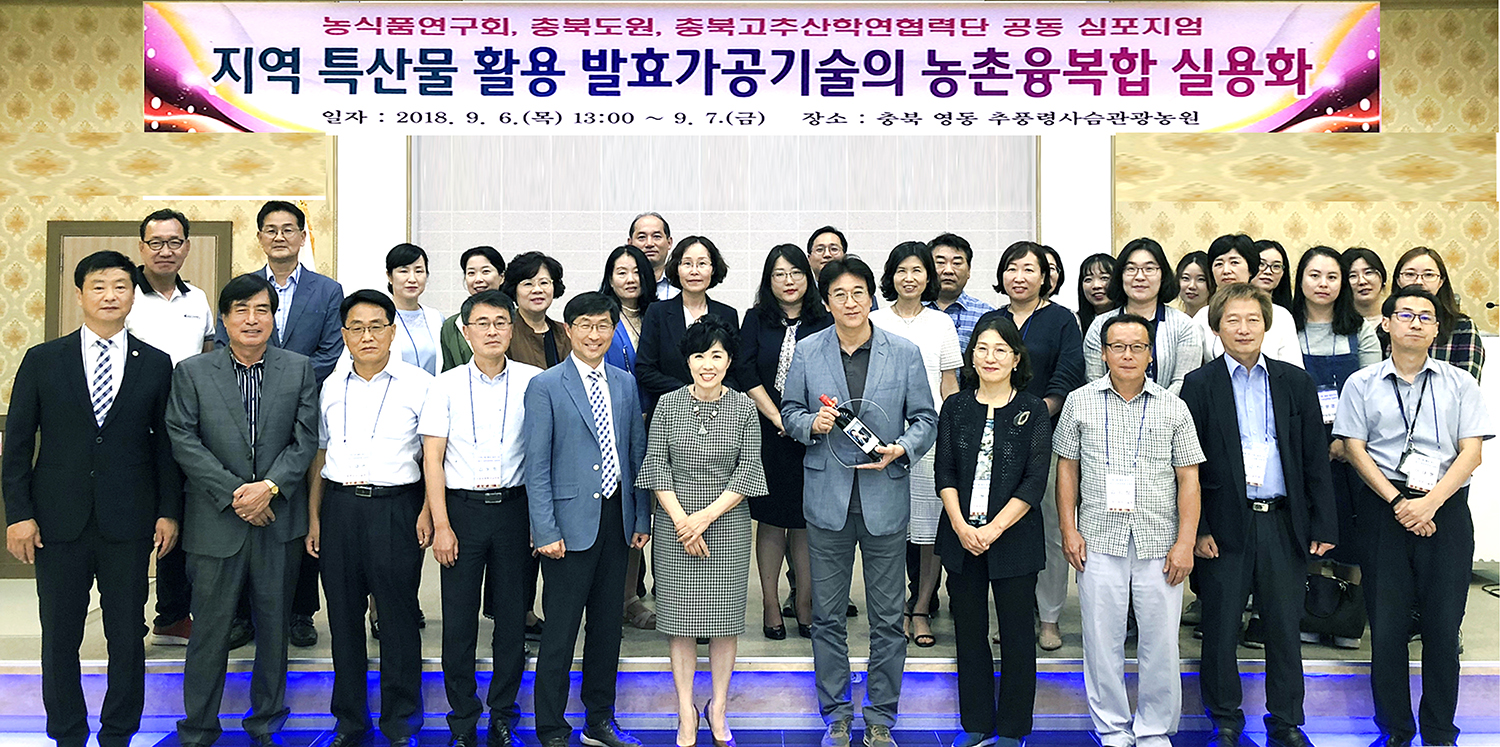 충북농업기술원은 농식품연구회(회장 한귀정), 충북고추산학연협력단(단장 김흥태)과 공동으로 지난 6일 충북 영동 추풍령사슴관광농원에서 전국 농촌진흥기관 식품연구자 등 120명을 대상으로 ‘지역 특산물 활용 발효가공기술의 농촌 융복합 실용화’란 주제로 심포지엄을 개최하였다. 이번 심포지엄은 기조 강연으로 ‘농식품 트렌드에 따른 농식품연구 방향설정(한경대 민승규 교수)’이란 주제 발표로 ‘고추씨의 항비만 물질 동정 및 메카니즘 구명(충북대 이준수 교수)’, ‘지역특산물 아로니아를 활용한 웰니스 제품개발 및 현장 실용화(충북농기원 엄현주 박사)’, ‘장류시장의 경쟁력 제고를 위한 현장지원(농과원 김소영 박사)’, 현장의 농촌 융복합 성공사례로 ‘착한농부와 6차산업(블루와인 진경석 대표)’과‘국산 종균활용, 장류의 새로운 도전(금봉산농원 조연순 대표)이란 발표가 이루어졌으며, 토론을 통해 구체적인 방안들이 논의 되었다.