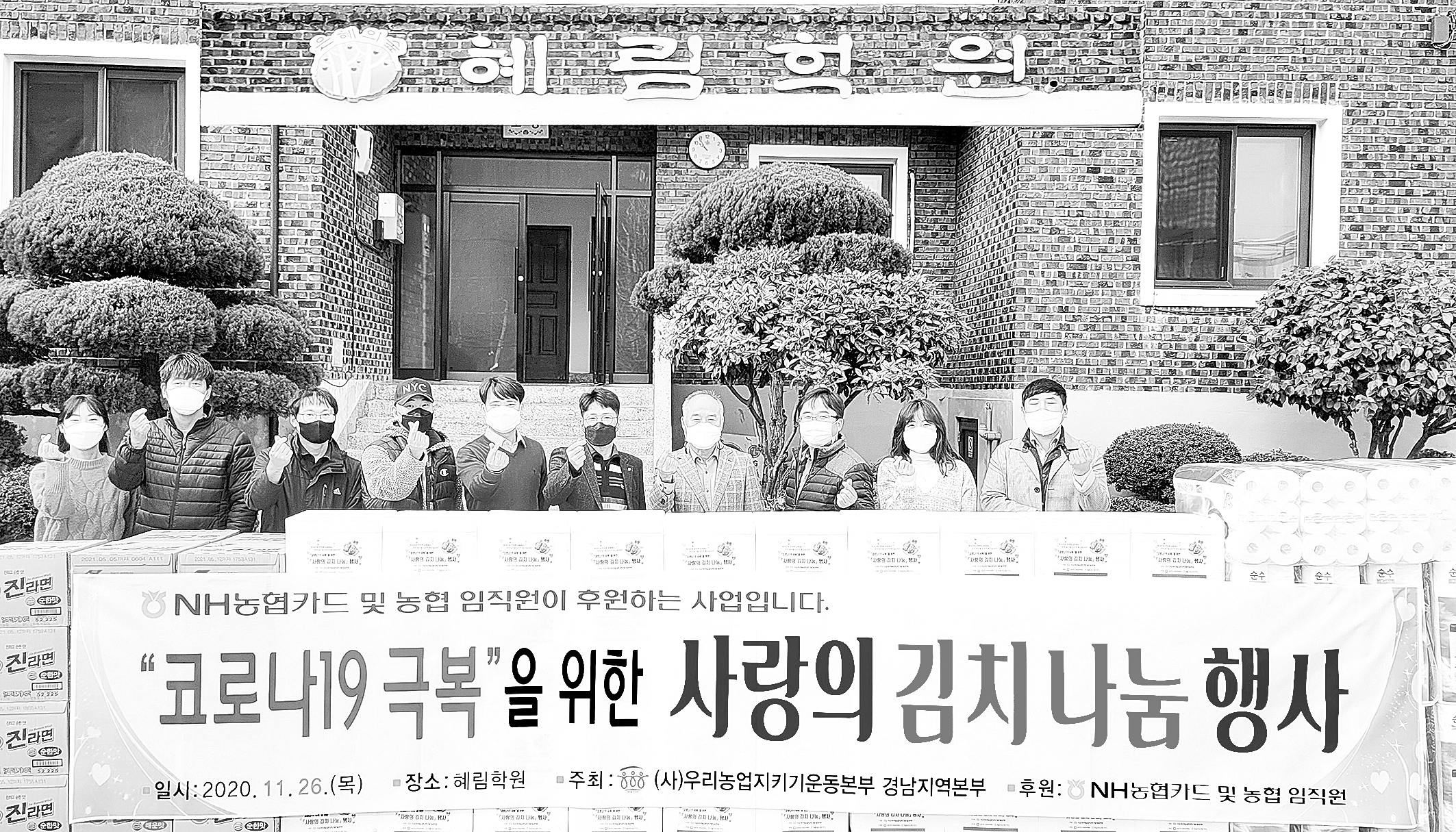 (사)우리농업지키기운동본부 경남지역본부, 김치나눔 행사 기사입력 2020.12.05 23:08 댓글 0 (사)우리농업지키기운동본부 경남지역본부(본부장 류승완)는 26일 의령에 위치한 사단복지법인 혜림학원을 방문하여 김장김치 10kg 80박스와 생활용품(6백만원 상당)을 전달하였다. 이날 행사에 농협에서는 류승완 본부장과 경남노조 대표간부들이 참석하였으며, 사단복지법인 혜림학원에서는 송요섭 원장이 직접 물품을 전달받고 감사의 뜻을 전했다. <저작권자ⓒ농림축산신문 & nongnews.kr 무단전재-재배포금지. > BEST 뉴스 경북화훼 수출산업 활성화, ·경북농협, ‘이탈리안 라이그라스(IRG) 파종시연회’ 개최 ·대구시, 신천서 벼 베기 체험 및 수확 기쁨 체험 ·대구농협-대구NH농협은행, 농촌 일손돕기 개최 ·충북농기원, 자체개발 ‘아로니아 특허기술’ 상품화 선점 ·전문가 칼럼 위로 목록 이름 비밀번호 자동등록방지 31543 등록