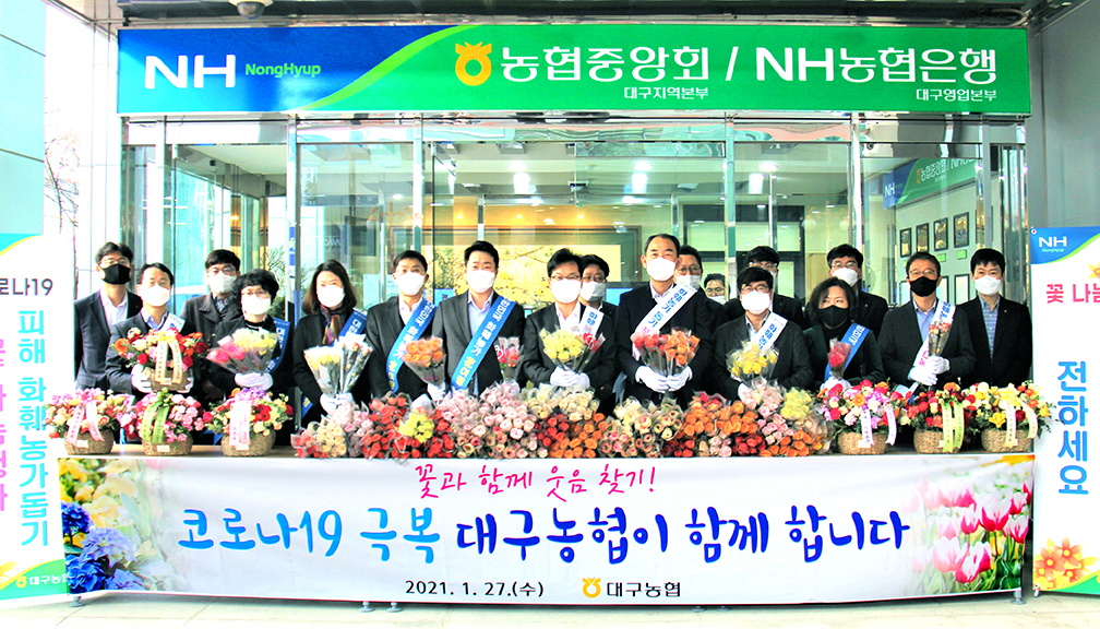 대구농협(본부장 이수환)은 지난 27일 지역본부 로비에서 박병희 영업본부장, 김경태 노조위원장 등과 함께 어려움을 겪고 있는 화훼농가를 돕기 위한 장미꽃 나눔 행사를 실시했다. 이번 행사는 코로나19로 인해 졸업식, 입학식 등 각종 행사들이 취소 및 간소화됨에 따라 화훼소비가 현저하게 감소하여 판로확보에 어려움을 겪고 있는 화훼농가의 고통을 분담하기 위해 마련되었다.