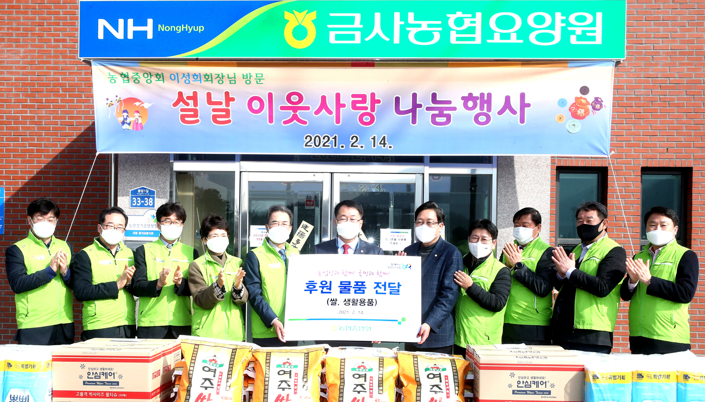 농협중앙회 이성희 회장은 김선교 국회의원(여주시·양평군)과 함께 지난 14일 경기도 여주시 금사농협(조합장 이칠구)요양원을 방문하여 ‘설명절 이웃사랑 나눔’을 위한 물품을 전달하며 온정을 나누었다.