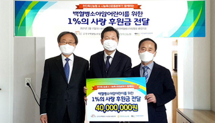 나눔축산운동본부(공동대표 김태환 · 하태식)와 천안축산농협(조합장 정문영)은 지난 17일 한국백혈병소아암협회 충청지회에서 백혈병소아암 어린이 환자들을 위해 치료 후원금 4,000만원을 후원했다. 이날 전달된 치료 후원금은 나눔축산운동본부와 천안축협의 매칭 기부사업으로 천안축협에서 소아암 어린이들에게 써달라며 2,000만원을 지정기부 하였고, 나눔축산운동본부에서 2,000만원을 추가 출연해 총 4,000만원을 한국백혈병소아암협회 충청지회(지회장 박우성)에 전달했다.