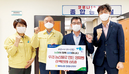 농협 창원시지부(지부장 박성호)는 지난 10일 창원시보건소(소장 이종철)를 방문, 코로나19 확산 방지를 위해 일선 현장에서 밤낮으로 일하는 보건소 직원들을 위해 위문품을 전달했다. 이번 전달 위문품은 양파가격 하락으로 어려움을 겪고 있는 농가 지원을 위해 양파소비 촉진운동의 일환으로 양파를 재료로 하여 만든 빵(100만원 상당)을 구입해 전했다.