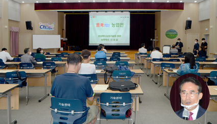 경북 청도군(군수 이승율)은 지난 29일 청도군농업기술센터(소장 권정애) 3층 대강단에서 청도군농민사관학교 귀농영농과정 교육생 30여명이 참여한 가운데 경상북도농업기술원 신용습 원장(원내사진)을 초빙하여 특강을 실시하였다. 이번 특강은 귀농인을 대상으로 ‘뉴노멀시대의 思考(사고)치는 농업인’이란 주제로 진행되었다.
