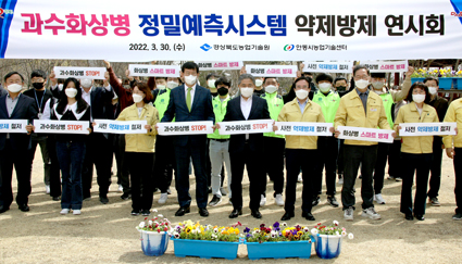 경북농업기술원(원장 신용습)은 최근 정밀예측시스템과 연계한 과수화상병 약제방제 연시회를 개최하였다. 전국 사과의 60%를 생산하는 사과 주산지 경상북도에서는 본격적인 영농철을 앞두고 작년에 처음 발생된 과수화상병 예방에 힘을 쏟고 있다. 과수화상병은 전염력이 강하고 치료약이 없는 식물검역병해충으로 발생하면 즉시 매몰 처리된다.