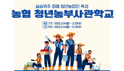 농협청년농부사관학교, ‘2022년도 교육생’ 모집 기사입력 2022.04.15 23:51 댓글 0 농협은 미래 농업·농촌을 이끌어 나갈 정예 청년농업인 농협청년농부사관학교 제7·8기 교육생을 모집한다. 2018년부터 개교하여 2021년까지 6개 기수 364명의 예비 청년농업인을 배출하였으며, 교육생의 특전으로 교육기간중에 농업용 기계(드론, 트랙터,굴삭기, 지게차 등) 자격증 취득의 기회를 제공하며 수료시 성적 우수자에게는 소정의 장학금도 지급할 예정이다. <저작권자ⓒ농림축산신문 & nongnews.kr 무단전재-재배포금지. > BEST 뉴스 NH농협은행 전북본부, 신규 ·농협 미곡종합처리장(RPC) 전국협의회, ‘2017년 정기총회’ 개최 ·농협 APC운영협의회, ‘2017년도 APC운영협의회 정기총회’ 개최 ·경남농협 검사국직원, ‘행복한 The-동행’ 봉사활동 ·대구 월배농협, ‘제4회 조합원 한마음전진대회’ 성료 ·대구 논공농협, ‘농협 상호금융대상’ 장려상 수상 위로 목록 이름 비밀번호 자동등록방지 63570 등록
