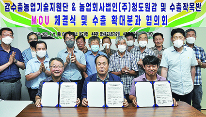 경북감수출농업기술지원단(단장 김종국, 경북대학교 교수)은 지난 11일 오후 5시 경북 청도군 청도읍 새마을로 574 농업회사법인주식회사 청도원감(대표 정진석) 2층 사무실에서 김종국 경북감수출농업기술지원단 단장, 정진석 농업회사법인주식회사 청도원감 대표, 태근수 청도원감수출작목반 회장, 이수원 경북감수출농업기술지원단 간사 및 감수출농업기술지원단 운영위원을 비롯해 관계자 등이 참석한 가운데 감수출농업기술지원단-농업회사법인주식회사 청도원감-청도원감수출작목반 간에 FTA 대응 및 지역농업 활성화를 위한 현판식이 있었다.