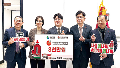 대구광역시 북구 매천로에 위치한 도매시장법인 효성청과(주)(대표이사 김형수)는 지난 27일 대구농수산물유통관리공사(사장 김상덕)에서 대구사회복지공동모금회를 통해 희망나눔 성금 3,000만원을 기부하였다. 이번 희망나눔 성금은 지역에 소외된 이웃에게 큰 보탬이 될 것으로 기대된다.