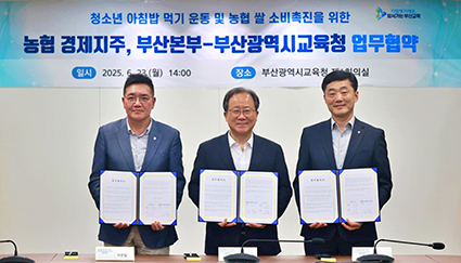 농협 경제지주(농업경제대표이사 박서홍)는 지난 23일 부산광역시교육청에서 이천일 품목지원본부장, 이수철 농협중앙회 부산본부장, 김석준 부산광역시교육감 등이 참석한 가운데 「청소년 아침밥 먹기 운동 및 쌀 소비촉진을 위한 업무협약(MOU)」을 체결했다.