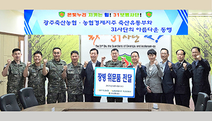 농협축산경제-광주축협, ‘31보병사단 위문품’ 전달 기사입력 2025.06.30 23:51 댓글 0 농협 축산경제(대표이사 안병우)와 광주축산농협(조합장 김재필)이 지난 4일, 광주광역시에 위치한 육군 제31보병사단을 방문해 군 장병들에게 위문품을 전달했다. 이번 방문은 국방의 의무를 성실히 수행하고 있는 군 장병의 사기진작과 군 급식 품질 향상을 지원하기 위해 마련되었으며, 육포데이(6월 4일)를 맞이해 1,000만원 상당의 목우촌 닭 가슴살 육포세트 등을 전달했다. <저작권자ⓒ농림축산신문 & nongnews.kr 무단전재-재배포금지. > BEST 뉴스 경북화훼 수출산업 활성화, ·경북농협, ‘이탈리안 라이그라스(IRG) 파종시연회’ 개최 ·대구시, 신천서 벼 베기 체험 및 수확 기쁨 체험 ·대구농협-대구NH농협은행, 농촌 일손돕기 개최 ·충북농기원, 자체개발 ‘아로니아 특허기술’ 상품화 선점 ·전문가 칼럼 위로 목록 이름 비밀번호 자동등록방지 58275 등록