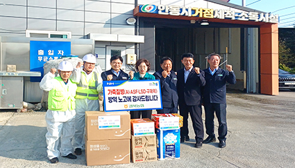 경북농협(본부장 최진수)은 지난 13일 전형숙 안동봉화축협 조합장과 함께 안동시 거점소독시설을 방문하고 차단방역에 힘쓰고 있는 가축방역 관계자를 격려하며 위문품을 전달하였다.