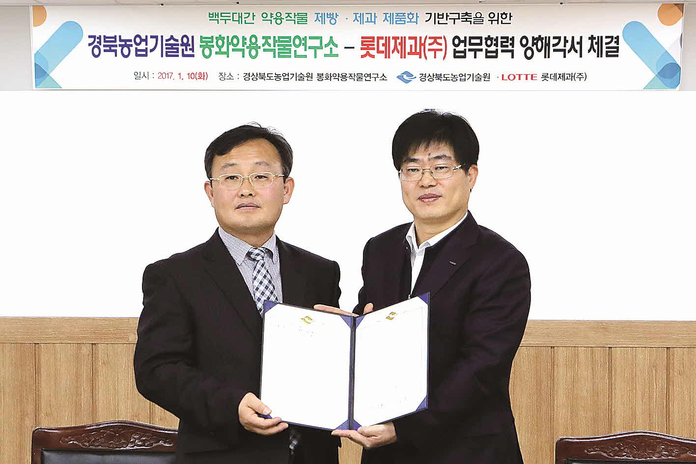 경북농업기술원(원장 박소득)은 지난 10일 봉화약용작물연구소(소장 김종수) 강당에서 국내 1위 제빵·제과 업체인 롯데제과와 식품관계자, 농업인 등 20명이 참석한 가운데 ‘백두대간 약용작물 제빵·제과 제품화 기반구축 MOU’를 체결하였다. 업무협약의 주요 내용은 경상북도 백두대간 권역에서 생산되는 약효가 우수한 약용작물을 이용하여 건강 빵 제품을 개발하여 농가소득을 증대시키고 고부가 가치를 창출하는 산업으로 육성하는 데에 상호 적극 협력하는 것이다.